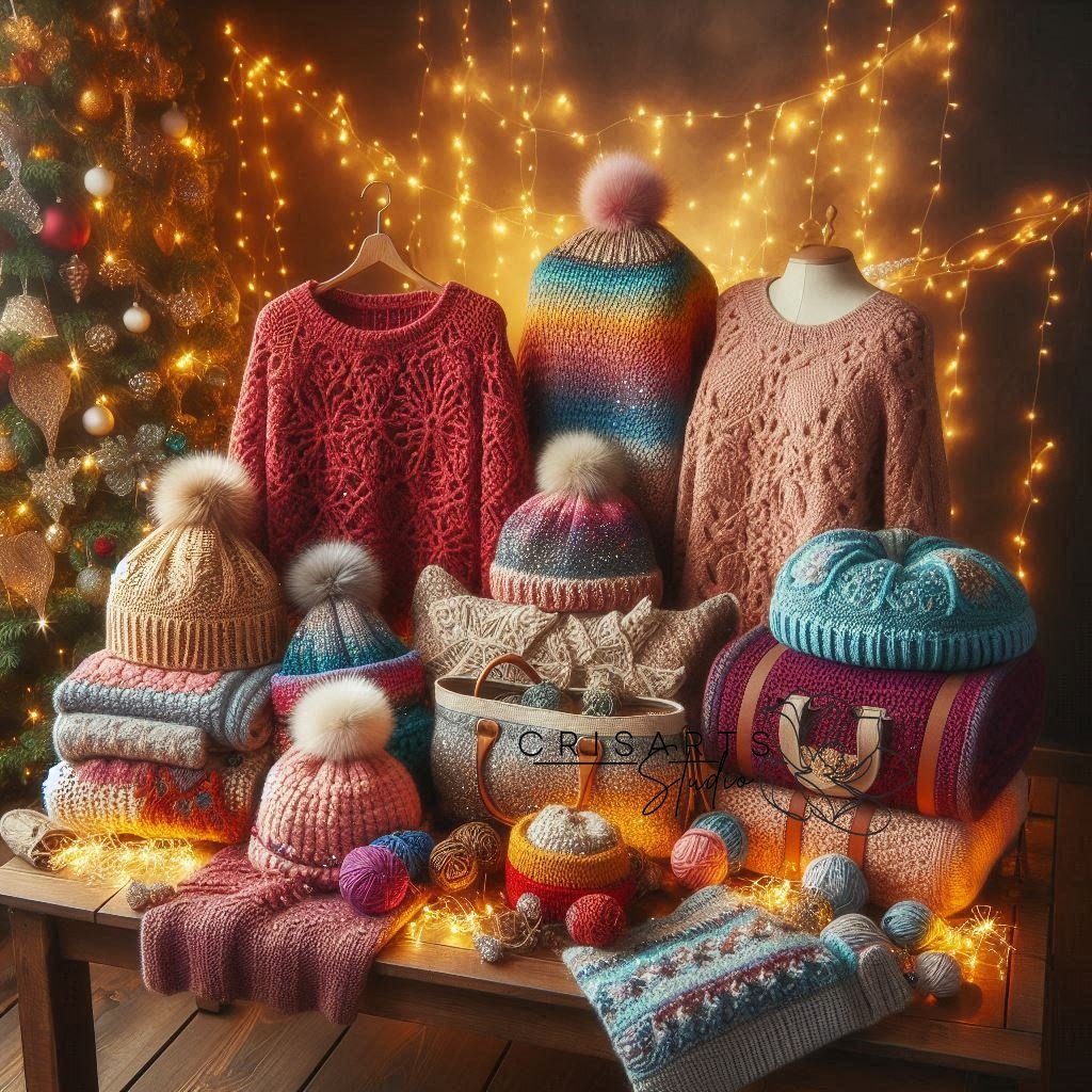 - Cachecóis, toucas e luvas em crochê com padrões natalinos.